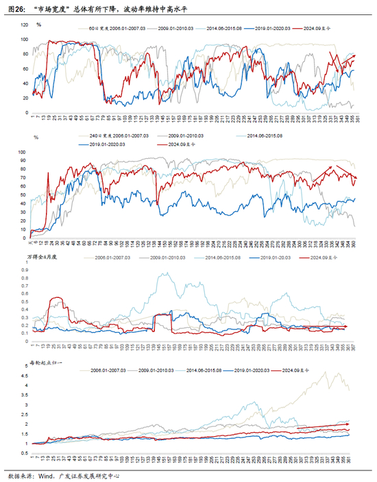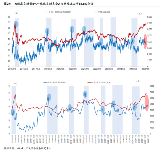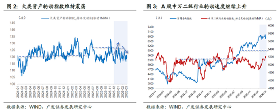 总量上,市场放量收跌,市场宽度集中度均降,轮动速度继续抬升,波动维持高位,股债波动比再拉大。(1)A股两市日均成交额进一步放量至2.62万亿元,周环比11.45%。(2)融资买入占比边际小幅下降,收于9.11%。(3)全A宽度有所下降,指数成分股中各成分股超越股票自身20日均线的占比下降至41.31%左右(上周为62.08%);超60日均线占比下降,至54.41%(上周为71.62%),240日均线占比下降,至67.53%水平(上周为75.3%)。(4)全A集中度降至中等分位,成交额前5%的个股成交额占全部A股比重下降至40.72%(上周为42.5%),处于58.8%历史分位。(5)我们编制的申万二级行业轮动速度加快,周均变动频次至5200次(上周为5125次)。(6)万得全A波动率维持中高水平,滚动1月的实际波动率(HV)降至15.1%(上周为15.7%)。股债年化波动率比值维升至14.01倍。