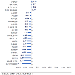 万得全A指数先抑后扬,但全周仍跌2.3%。10年国债利率下行0.67BP至1.78%。作为离岸市场的港股,与全球市场联动更强,恒科领跌-3.7%,跑输恒指(-3.28%)与恒生国企(-2.6%),较A股跌幅较大。与上证50高度相关的离岸指数则温和下跌——富时中国A50指数期货周跌0.15%。而中概股下跌明显,纳斯达克金龙指数周跌4.35%。