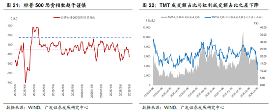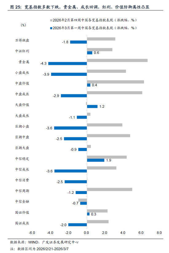 结构上,新老资产均衡深化,风格关注自“硬科技+高弹性”切换至“硬资产+低波动”,大盘价值相对韧性。(1)宽基普调,大盘相对韧性。中证500、中证1000、沪深300、上证50分别录得-3.4%、-3.6%、-1.1%、-1.5%。(2)价值优于成长,国证成长、价值,分别录得-2.0%、0.3%;双创指数中,行业分布更均衡的创业板指较科创50更抗跌,分别录得-4.9%与-2.4%。(3)硬资产与稳定防御板块占优。中信风格中稳定风格收涨1.9%、成长收跌3.6%。金融、周期介于中间,分别录得-0.7%、-1.2%。贵金属板块由涨转跌4.3%。(4)中证红利连续两周收涨,本周涨0.6%。红利获资金关注度明显上升,TMT与红利的成交占比之差下降至-0.89倍标准差(上周为0.26倍)。(5)细分一级行业上,石油石化、煤炭、公用事业领涨,分别录得8.1%、3.8%、3.4%;传媒、有色金属、计算机领跌,分别录得-7.0%、-5.5%、-5.3%。