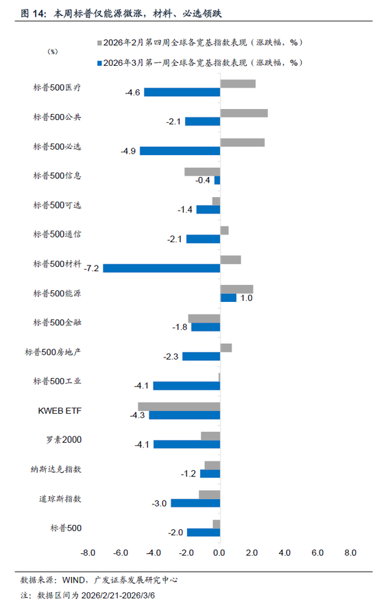 一是全球股市普调,“避险交易”为主,“事件与新主线交易”为辅,“修复交易”尚待形成。市场风偏持续承压,美股能源、软件股收涨;日欧股与新兴市场跌幅更深。我们编制的大类资产轮动指数维持中高位,周均变动频次至120次(上周为118次)。MSCI发达市场跌2.95%、新兴市场跌5.57%。美股三大指数齐跌,股市情绪高度谨慎,地缘安全溢价上升而非农等经济数据干扰货政前景,标普500恐贪指数大幅降至-156.4(上周为-10.97)。纳指、标普500、道指录得-1.24%、-2.02%、-3.01%。VIX指数环比升48.5%至29.49%高位。标普行业中,除能源(+1.0%)外全线下跌,防御板块未能继续支撑。材料(-7.9%)、必选(-4.9%)领跌,罗素2000指数(小盘股)下跌4.1%。金融与非必选跌幅最为温和,分别跌1.8%、1.4%。科技领域,软件股强劲反弹,而芯片股大幅承压,费城半导体指数下跌7.21%。美股科技七姐妹指数相对抗跌(周跌0.64%),内部分化鲜明,GOOGLE领跌,录得-4.25%。微软、亚马逊在七姐妹内部表现较好,分别录得4.13%、1.53%,英伟达小幅上涨0.36%。特斯拉、META、苹果分别录得-1.44%、-0.51%、-2.54%