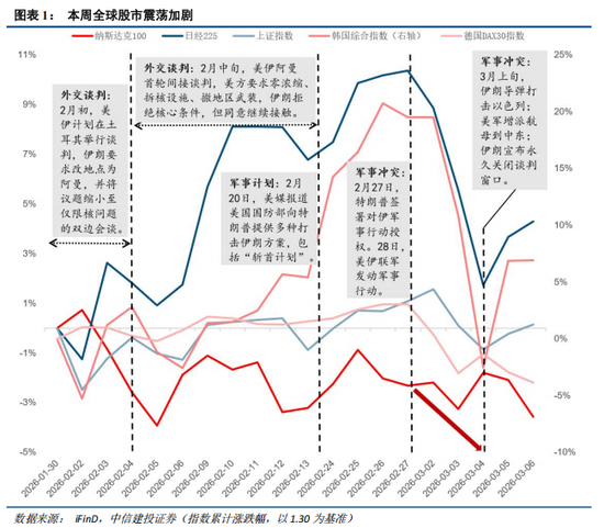 近期美以对伊朗的军事打击引发全球股市震荡,美股、A股出现调整,日韩及欧洲股市受冲击更为显著。复盘近20年中东7次重大冲突,A股情绪杀跌周期偏短,而当前市场调整充分,短期恐慌冲击有望修复。但需注意战争持续对全球通胀预期和产业造成的长期影响,推升原油、天然气价格,利好航运企业利润,同时引发能源、化工行业结构性通胀风险。政策方面,2026年两会明确“稳中求进、提质增效”的政策取向,宏观政策兼顾财政结构优化与货币传导效率,产业政策聚焦集成电路、生物医药等智能经济领域及碳达峰目标,将逐步引导投资者关注点从地缘冲突转向基本面与政策红利。