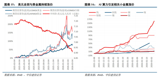 金属价格上涨主要受地缘政治以及AI算力两大因素催化。地缘紧张局势叠加去美元化浪潮,推动各国央行增持黄金作为储备资产,直接支撑金价。同时,作为战略资源的稀土,其供应端常因地缘摩擦而受扰,轻稀土近期已涨价。AI算力消耗扩张推动金属需求上升。AI算力中心的建设需要大量电力,带动了电网投资,从而拉动了对铜的需求。此外,芯片、服务器及散热系统等硬件制造,也高度依赖钨、钽、铟、镓、钼、锡等小金属。