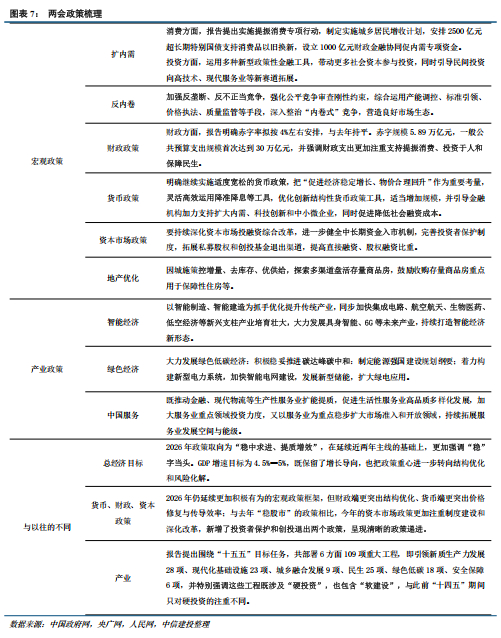 同时,近期两会的开展也会逐步将投资者的关注点拉回到基本面和政策趋势。总基调层面,2026年政策取向为“稳中求进、提质增效”,经济目标实现更注重质量,GDP增速目标从5%下降至4.5%—5%。宏观层面,延续更加积极有为的宏观政策框架,但财政端更突出结构优化、在提消费和保民生方面增加财政支出,货币端更突出价格修复与传导效率、强调资金流入中小企业和科技产业。产业层面,强调大力发展集成电路、航空航天、生物医药、低空经济、具身智能等智能经济,加速推动碳达峰,持续拓展服务业发展空间与能级。