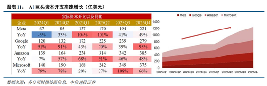 1)从海外产业链与云厂商指引看,AI算力相关资本开支仍处于加速兑现阶段。以Meta为例复盘头部公司资本开支指引,2025年三季报发布已经连续9次上调指引,上调近400亿美元。26年预期全年大幅上调,同比上升近60%。Meta占比约19%,按照1350亿美元测算,则四巨头全年Capex约7105亿美元(yoy+92.85%)。