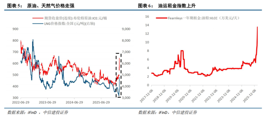 然而,战争如果持续,对全球通胀预期和部分产业造成的长期影响仍然值得密切关注,尤其是能源、化工以及航运等行业。霍尔木兹海峡承担全球20%的原油海运贸易以及20%的液化天然气贸易,在该海峡停运之后,原油、天然气价格预计上涨。同时,中国对中东地区的甲醇进口占总甲醇进口数量的70%,供应收缩的预期将推动甲醇价格弹性增大。油运租金上升,马士基、达飞等航运巨头暂停海峡通行,叠加战争险保费上涨 50%,多重因素共同增厚航运企业利润。若地缘冲突持续较久,会持续影响这些产业供给,引发长期结构性通胀。