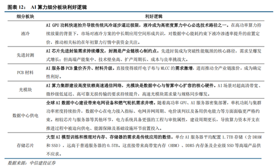 AI算力2026年增速判断见顶,但体量巨大,巨额消耗上游材料,将引发整个产业链的缺乏及涨价,利好存储芯片、PCB材料(玻纤电子布、MLCC)、光模块、液冷、先进封测,数据中心供电(电网设备、燃气轮机)等。