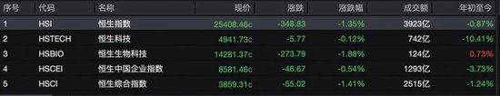 3月9日,港股午后跌幅收窄。截至收盘,恒指跌1.35%,报25408.46点;恒生科技指数跌0.12%,报4941.73点,恒生国企指数跌0.54%,报8581.46点。