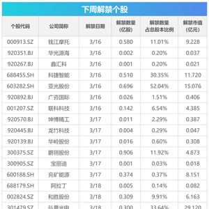 下周(3月16日-3月20日)A股有33只个股面临解禁,以3月13日收盘价计算,解禁总市值达267.86亿元,其中,华宝新能解禁市值超60亿元。