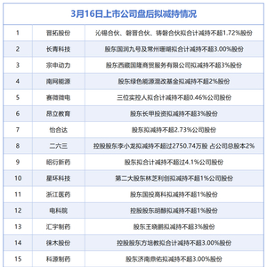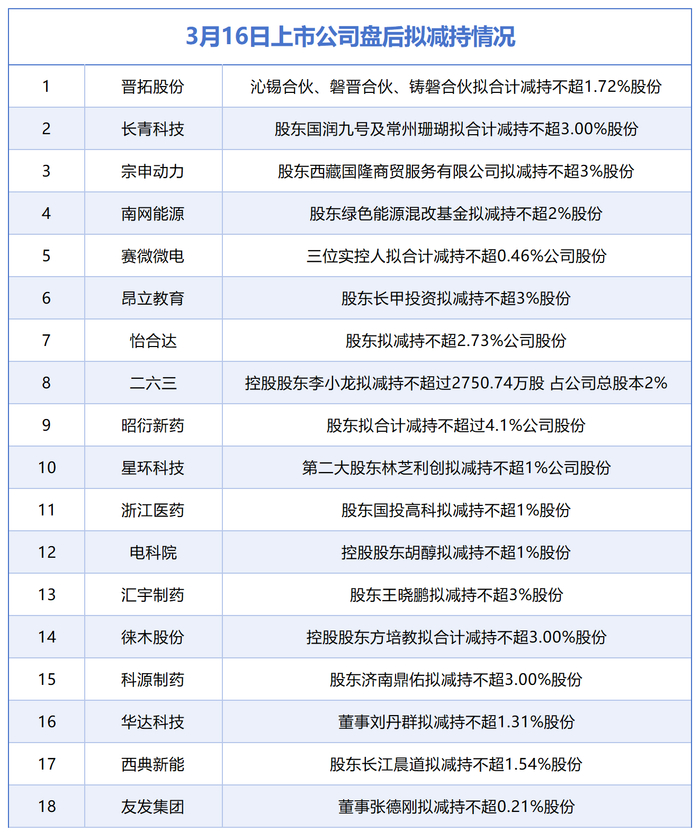 据统计,3月16日,盘后晋拓股份、长青科技、宗申动力、南网能源、赛微微电、昂立教育、怡合达、二六三、昭衍新药、星环科技、浙江医药、电科院、汇宇制药、徕木股份科源制药、华达科技、西典新能、友发集团在内的18家A股上市公司披露拟减持情况,当日暂无A股公司披露增持情况。