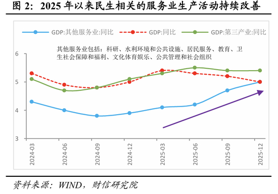 服务业:新动能、服务消费、民生相关生产维持较快增长。1-2月份,服务业生产指数同比增长5.2%,比上年12月份加快0.2个百分点,延续改善态势。结构上,主要源于三方面的动能:一是受益于人工智能相关需求带动和金融市场高景气度,信息传输软件和信息技术服务业、租赁和商务服务业、金融业等生产性服务业维持较快增长,1-2月增速分别达10.1%、8.2%、7.0%。二是在春节因素的带动下,交通运输、住宿餐饮等服务消费相关的生产指数分别增长6.3%、5.4%,增速快于整体且比去年12月份明显回升。三是“投资于人”相关的生产活动或延续较快增长,受益于宏观政策加大“投资于人”力度,2025年以来教育、医疗、文体娱乐等民生相关服务业增加值增速持续改善,预计这一趋势大概率延续(见图2)。