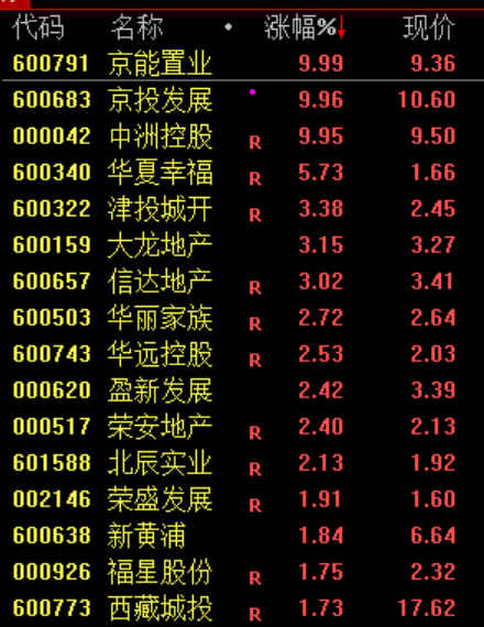 房地产板块反弹,中洲控股、京能置业等涨停。