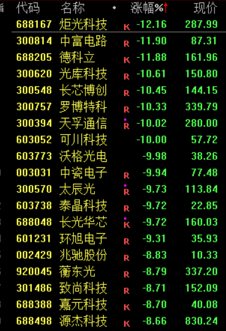 下跌方面,CPO等算力硬件股集体调整,天孚通信、德科立、光库科技等多股跌超10%。