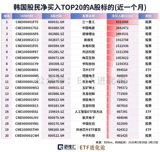 韩国预托结算院旗下SEIbro数据显示,近一个月以来,韩国股民净买入TOP10的A股标的为:三一重工、中国电建、赣锋锂业、英维克、长电科技、光迅科技、梅花生物、中际旭创、芯片ETF、顺络电子。