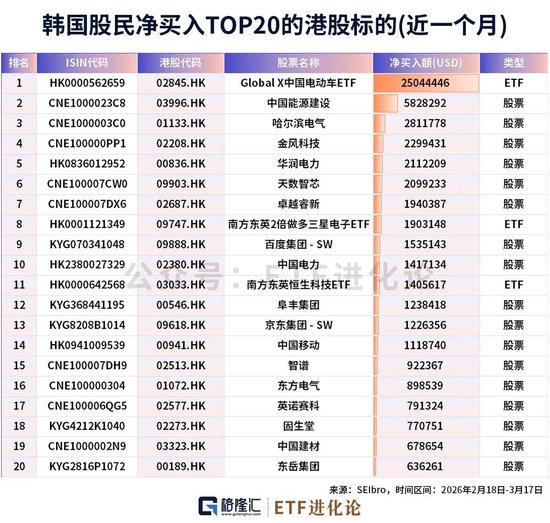 近一个月以来,韩国股民净买入TOP10的港股标的为:Global X中国电动车ETF、中国能源建设、哈尔滨电气、金风科技、华润电力、天数智芯、卓越睿新、南方东英2倍做多三星电子ETF、百度集团 - SW、中国电力。