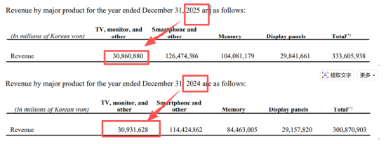 在业绩层面,2025年三星业绩呈现极端分化,半导体部门凭借HBM高端存储芯片,第四季度营业利润暴增465%至16.4万亿韩元,贡献集团80%利润。而家电与电视业务则连续两个季度亏损,成为业绩拖累。分产品来看,电视和显示产品的营收下滑,成为主要因素。据业绩报告,2025年全年三星电视及显示产品营收30.86万亿韩元,较2024年的30.93万亿韩元轻微下滑。
