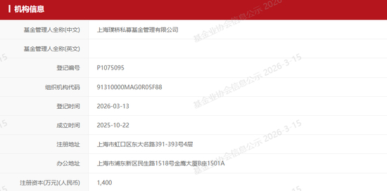 中国证券投资基金业协会数据显示,璞桥资产成立于2025年10月,注册资本1400万元,注册地位于上海虹口,于今年3月13日正式登记。曹名长为实际控制人,兼任公司法定代表人、总经理、执行董事、投资总监等职务。