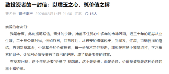 2026年3月14日晚,在致投资者的一封信中,曹名长强调,这次创业不是为了折腾,而是为了延续价值投资的实践。