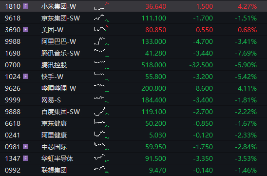 盘面上,权重科技股多数下跌,尤其是腾讯大跌近6%,阿里巴巴、百度跌幅在2%以上,小米则逆势大涨超4%。
