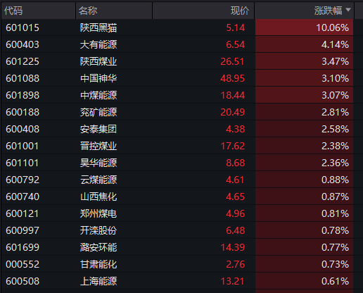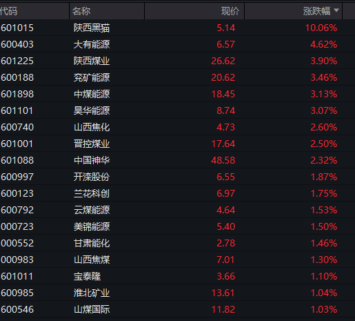 煤炭板块震荡拉升,陕西黑猫封涨停,大有能源、陕西煤业、晋控煤业、中国神华、宝泰隆跟涨。