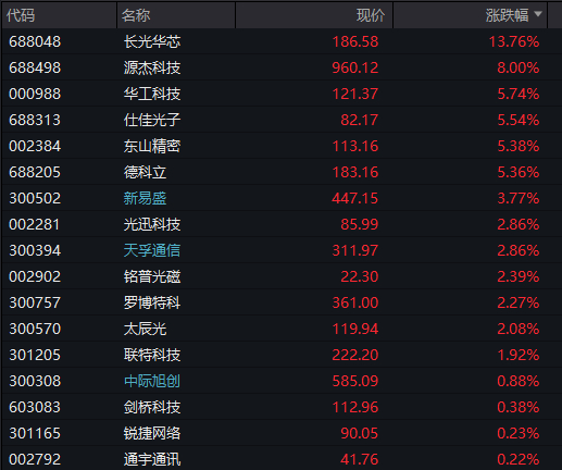 具体来看,算力硬件股继续大涨,CPO、光电路交换机等方向走高,长光华芯、源杰科技、华工科技等涨幅居前。