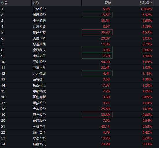 早盘化工板块大面积高开,兴化股份一字涨停,金牛化工、宝丰能源、金煤科技、四川美丰、诚志股份涨幅靠前。