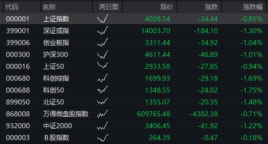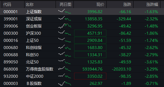 上证指数跌幅扩大至1.6%,失守4000点关口,为1月5日以来首次,创业板指跌1.5%,深证成指跌2.2%。有色金属、石化、化肥农药、锂矿、稀土跌幅居前。