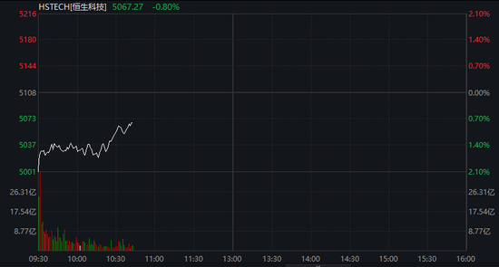 恒生科技指数跌幅收窄至0.9%,开盘一度跌超2%。