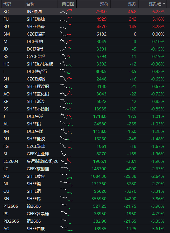债市方面,国债期货普遍上涨。商品方面,国内商品期货大面积下跌,仅原油、燃油大涨,钯金、沪银等金属期货全线下跌。核心市场走势:
