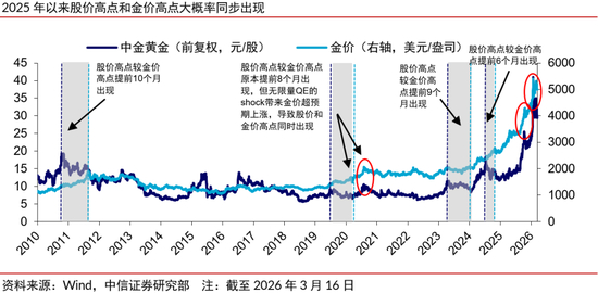定量角度,随着2月初以来黄金板块的短期调整,股价分位已显著向下脱离历史极值区间,估值分位优势则更为显著,头部公司2026年预期PE下探至15-20倍的历史低位,安全边际突出。定性角度,相比于历史上黄金板块股价高点通常提前与金价高点6-10个月出现,2020年以来(尤其是2025年以来)金价频繁超预期上涨的背景下,股价与金价高点同步的规律已得到多次验证。随着年内金价迈向新高,黄金板块的股价新高值得期待。