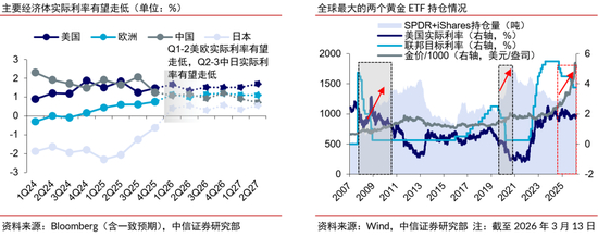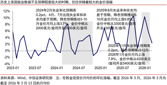 1)一是流动性宽松通道不改,“类滞胀”担忧提供潜在催化。近三年美国就业不及预期程度较高的时期,金价通常加速上涨,包括2024年3-10月、2025年9-10月和2025年12月-2026年1月。2026年2月美国非农和失业率数据罕见地再次共同指向美国就业走弱风险,有利于市场降息预期升温,我们预计沃什担任美联储主席后全年仍有1-2次25bps的降息,流动性宽松通道不会反转。叠加关税、原油对于美国通胀的影响滞后体现,Q1-3主要经济体的实际利率有望相继走低,有助于ETF增仓并利好金价。历史上仅有两次战争(两伊战争、俄乌战争)后的油价上涨使得美联储转向紧缩,并导致金价下跌,战争爆发时均美国通胀均具备本就高企的特征,而当前的静态通胀水平与油价传导幅度均已大幅降低,且美国的政策导向也存在较大差异。考虑到历史上美国滞胀时期的金价上涨概率较大、涨幅较高,当前美国经济“类滞胀”风险加剧,对金价有潜在利好。