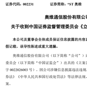 *ST奥维(002231)3月20日晚间公告,近日收到中国证券监督管理委员会(简称“中国证监会”)出具的《立案告知书》。因公司涉嫌信息披露违法违规,根据《中华人民共和国证券法》《中华人民共和国行政处罚法》等法律法规,中国证监会决定对公司立案。
