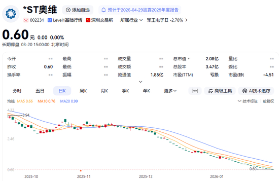 交易软件显示,*ST奥维股价报0.6元/股,总市值为2.08亿元。