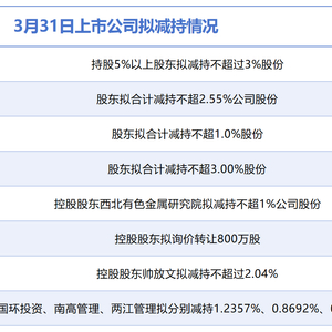 3月31日增减持汇总:津膜科技等8家公司拟减持,当日无A股增持(表)