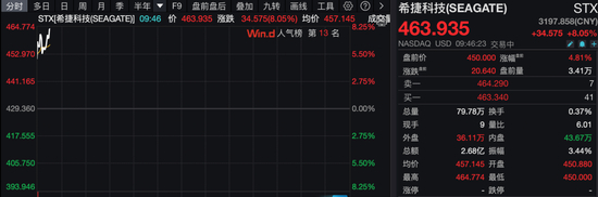 存储概念股盘初集体走强。希捷科技大涨超8%,闪迪涨超4%,西部数据涨近4%,美光科技涨近3%。消息面上,摩根士丹利将希捷科技纳入其“首选股名单”。