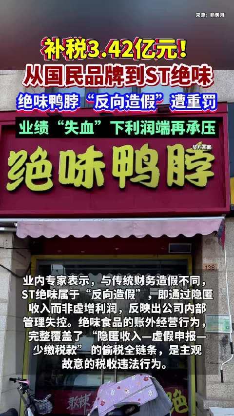 视频 | 补税3.42亿元!从国民品牌到ST,绝味鸭脖7亿元加盟商装修款去哪了? 市场资讯 04.07 20:50 来源:江苏经济报 补税3.42亿元!从国民品牌到ST,绝味鸭脖7亿元加盟商装修款去哪了?