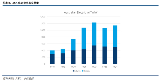 (4)物理与金融市场双轨联动,形成“物理保供应、金融稳价格”的闭环。电力金融市场以NEM现货为底层、ASX交易所与OTC场外双轨并行,是全球最成熟、流动性最强的电力衍生品市场之一。ASX自2002年起挂牌电力期货与期权,覆盖昆士兰、新南威尔士等主要区域,2024财年名义交易额超1040亿澳元、日均成交约4.5太瓦时,以现金结算为主,不涉及物理交割。市场以发电商、售电商、垂直一体化企业为核心,叠加投行、做市商与机构投资者,通过基荷/峰荷期货、掉期、300澳元上限期权等工具对冲现货价格剧烈波动风险。场外市场以ISDA协议为基础,提供定制化合约,部分通过ASX集中清算以降低信用风险。随着可再生能源占比提升,光伏曲线、虚拟储能掉期等创新产品逐步涌现,适配新能源间歇性特征。