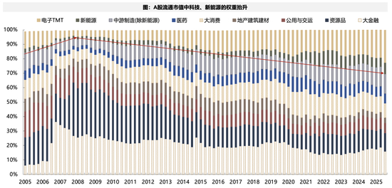在拥挤度占比中枢抬升的背后,我们也能看到科技板块市值占比的抬升。以申万一级行业为例,计算电子、传媒、通信、计算机四个行业流通市值的占比,该数值也从2007年的3.6%,上升至2026Q1的21.7%,背后是科技产业趋势的发展与中国经济结构的转型。而这种市值占比的上升,自然会带来成交占比中枢的抬升。