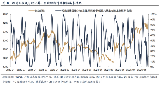 ④最后,其余刻画市场短期交易的指标尚未提示过热:交易集中度只是刻画市场交易的一个维度,我们也构建了短期情绪指标衡量市场短期情绪水位,当前这些指标自3月以来从底部修复后,尚未提示过热。