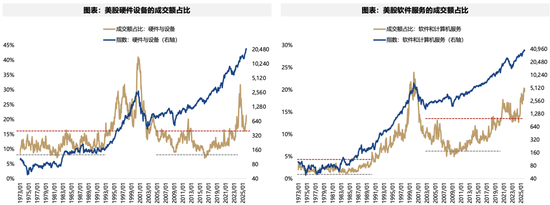 当下,美股科技大板块的市值占比为39%(硬件20%、软件19%),几乎在历史最高水平,而成交额占比为41%(硬件21%、软件20%)也处在历史中高位置。
