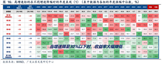 可以发现规律:(1)增速边际回落,但维持较高增速的标的,仍有超额收益(第1组~第5组);(2)第4组是临界线(增速>30%),当增速降至30%以下,市场表现显著变差。