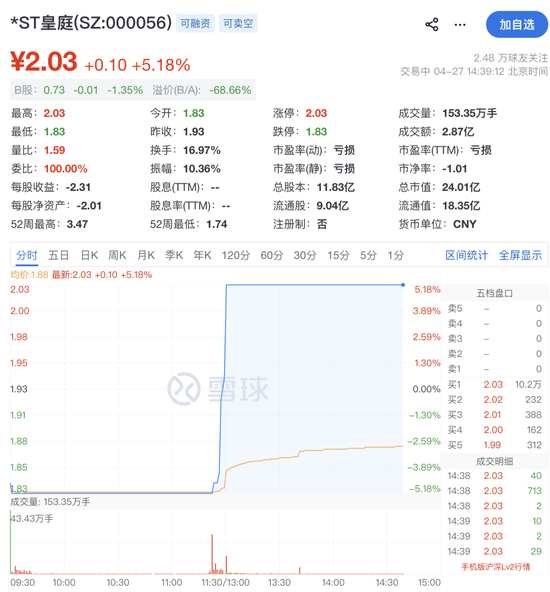 4月27日,*ST皇庭午后涨停,走出“地天板”,成交额为2.87亿元。截至目前,*ST皇庭股价报2.03元/股。