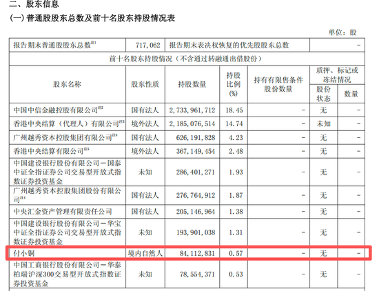 中信证券2026年一季报显示,自然人付小铜持有中信证券0.84亿股A股,持股比例为0.57%,位列第九大股东。