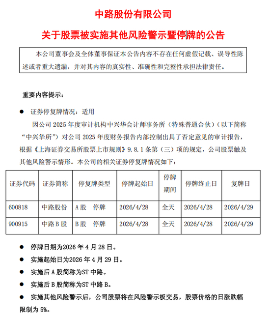 中路股份4月27日晚公告称,因公司2025年度审计机构中兴华会计师事务所对公司2025年度财务报告内部控制出具了否定意见的审计报告,根据《上海证券交易所股票上市规则》相关规定,公司股票触及其他风险警示情形。公司股票及债券将于4月28日停牌一天,4月29日起实施其他风险警示。