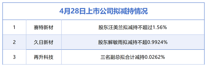4月28日增减持汇总:赛特新材等3股拟减持,暂无A股增持(表) 新浪证券 新浪证券官方账号 04.2821:51 关注 据统计,4月28日盘后,赛特新材、久日新材、再升科技3家A股上市公司披露拟减持情况,当日暂无A股公司披露增持情况。