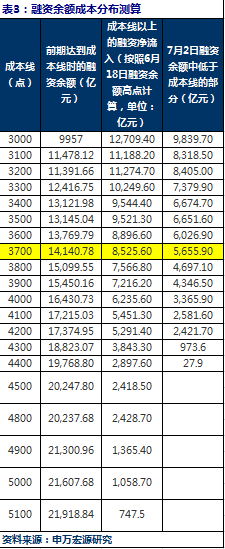 下表是我们统计的在不同点位上融资余额及其变化,以此可以大致估算出融资余额的成本分布。3月24日大盘点位约3700点,与当前点位接近,当时融资余额为1.41万亿,到6月18日的融资余额增加8525亿至2.26万亿,也就是说大约8000多亿融资盘在3700点以上进入,考虑到近期已经流出的部分,按照7月2日的融资余额计算,依然大约有5000亿的融资余额低于成本线,如果大盘无法企稳或者继续下跌,将有更多的投资者主动平仓融资盘。