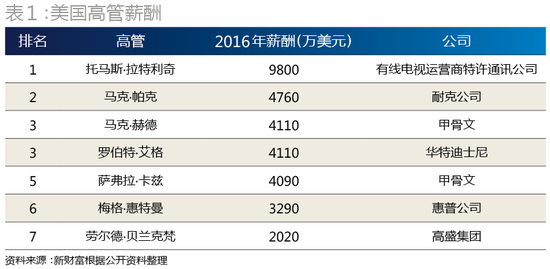 Equilar的报告显示,2016年美国100强企业中的CEO平均薪酬创自2013年以来最大涨幅,其较2015年上涨100万美元,至1660万美元(约合1.14亿元),接近于腾讯高管最高薪前5人的薪酬,但仍高于A股中其他上市公司的高管薪酬。而美国最高薪的通讯公司CEO托马斯·拉特利奇的9800万美元(约合6.74亿元)则相当于国内(腾讯)最高薪2.749亿元的2.4倍。