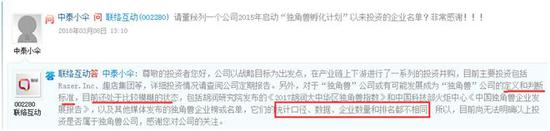 也有投资者请上市公司联络互动列出公司2015年启动“独角兽孵化计划”以来投资的企业名单。联络互动回应称,目前主要投资包括Razer.Inc、趣店集团等。