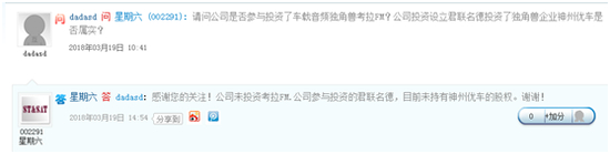 星期六则表示,公司未投资考拉FM;公司参与投资的君联名德,目前未持有神州优车的股权。