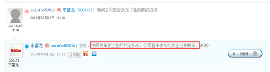 东富龙表示,按照独角兽企业的判定标准,公司暂未参与此类企业的投资。
