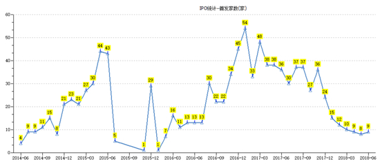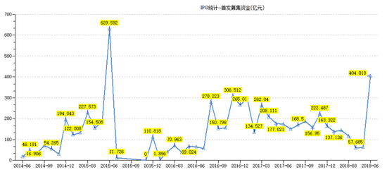 在月度发行规模上,2015年6月大牛市时,IPO融资规模创出近几年最高募资额度,首发募资高达630亿元,此后A股暴跌,IPO融资规模也是大规模缩水。但是,2018年6月IPO发行企业只有9家,但募资规模却高达404亿,创出3年来最高募资额度。主要是独角兽和巨型企业的回归,富士康、宁德时代等接连上市,富士康、宁德时代首发募资分别为273亿和131亿,也就是我们看到的6月份募资规模404亿元。